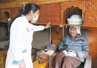 患者在林芝市藏医院体验头浴疗法。 本报记者 张博岚摄