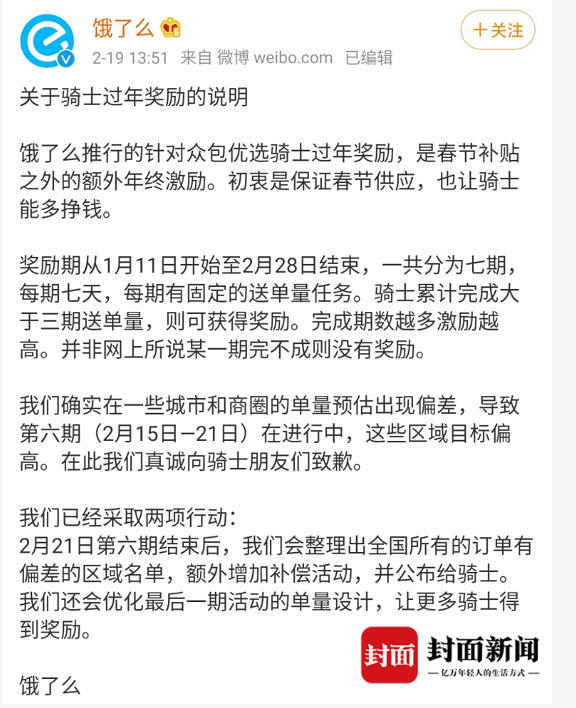 2月19日,饿了么官方回应称,平台推行的针对众包优选骑士过年奖励,是春节补贴之外的额外年终激励。初衷是保证春节供应,也让骑士能多挣钱。奖励期从1月11日开始至2月28日结束,一共分为七期,每期七天,每期有固定的送单量任务。骑士累计完成大于三期送单量,则可获得奖励。完成期数越多激励越高。并非网上所说某一期完不成则没有奖励。