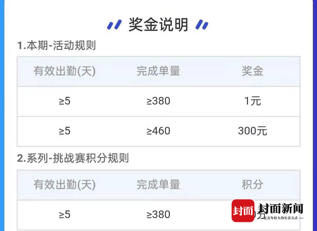 2月20日晚,封面新闻记者联系上代表骑手发声的博主@外送江湖骑士联盟盟主,他称该活动除了8200元奖励以外,还另有套路,目的是笼络优选骑手,让众包骑手和优选骑手之间相互竞争,最后拉低单价。