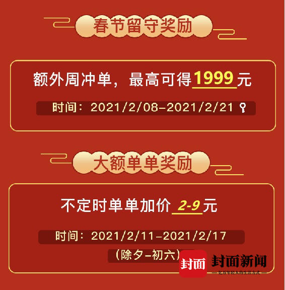 此外,多北京优选骑手向@外送江湖骑士联盟盟主反映,饿了么在春节前曾对优选骑手提出“春节留守奖励”,即在2月8日至2月21日冲单,最高可得1999元,以及“单单加价”活动,即2月11日到2月17日不定时加价2-9元,但骑手们提到,“照理说每单都会加价,但很多时候都没有加价。”