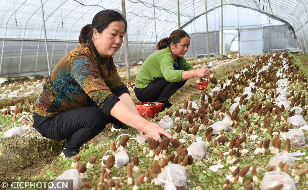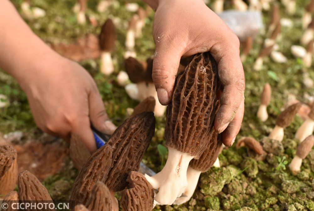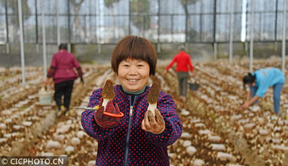 ↑2021年2月21日,四川省内江市农业科学院羊肚菌种植试验示范大棚里,工作人员在采收羊肚菌。CICPHOTO/黄正华 摄