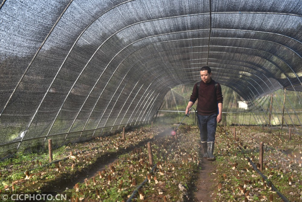↑2021年2月21日,四川省内江市农业科学院羊肚菌种植试验示范大棚里,工作人员在给羊肚菌洒水。CICPHOTO/黄正华 摄