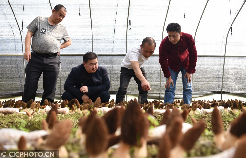 ↑2021年2月22日,贵州省铜仁市松桃苗族自治县世昌街道偏岩社区羊肚菌基地设施温棚里,农业技术人员(右二)指导村民羊肚菌种植技术。CICPHOTO/龙元彬 摄