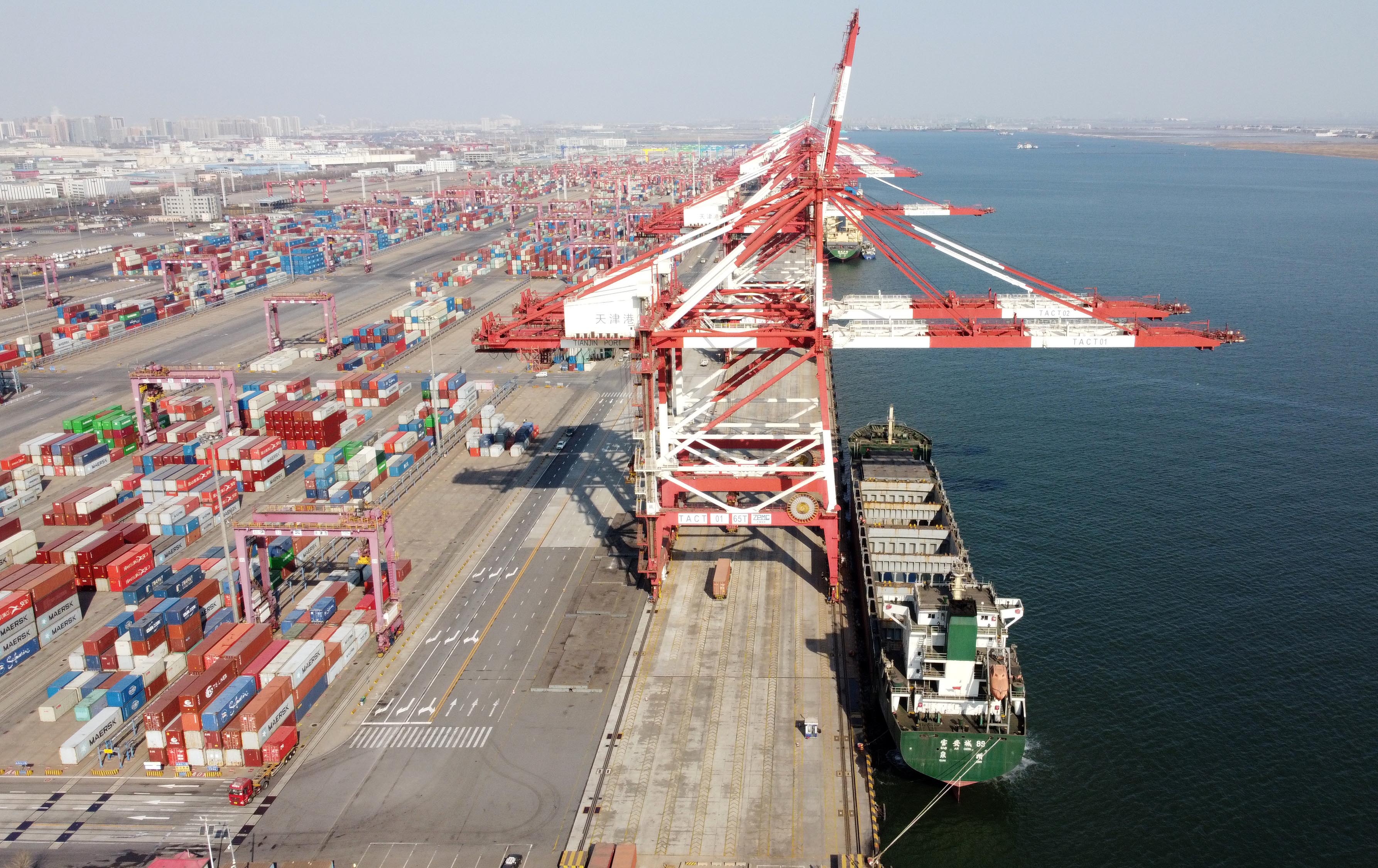 2月22日,从河北黄骅港驶来的宝安城89号货轮停靠在天津港联盟国际集装箱码头。(无人机照片)新华社记者赵子硕 摄