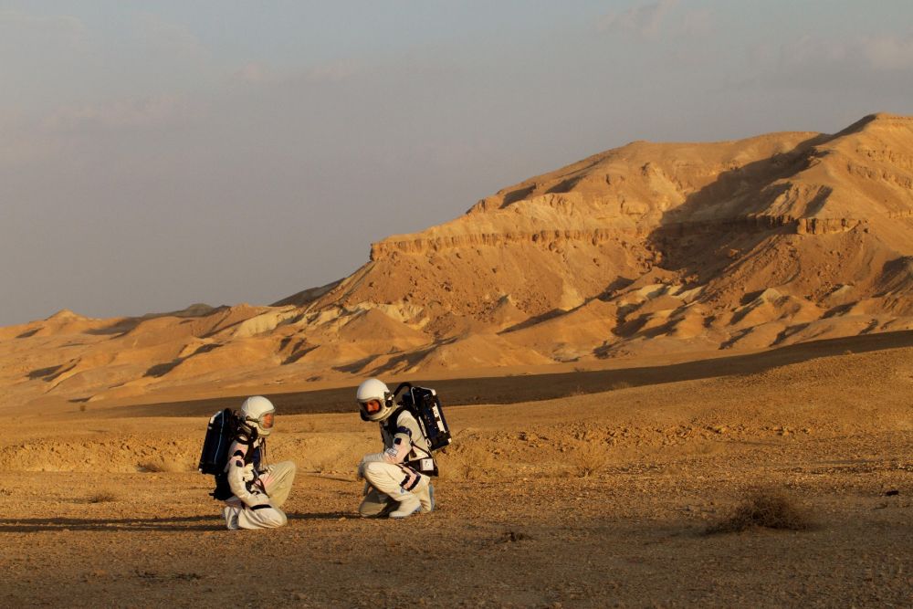 2018年2月18日,在以色列内盖夫沙漠中的火星沙漠研究站,志愿者“宇航员”在模拟火星环境中进行科学试验,探索人类如何在火星生存,这也是以色列首次开展火星沙漠试验。(新华社发,吉尔·科恩·马根摄)