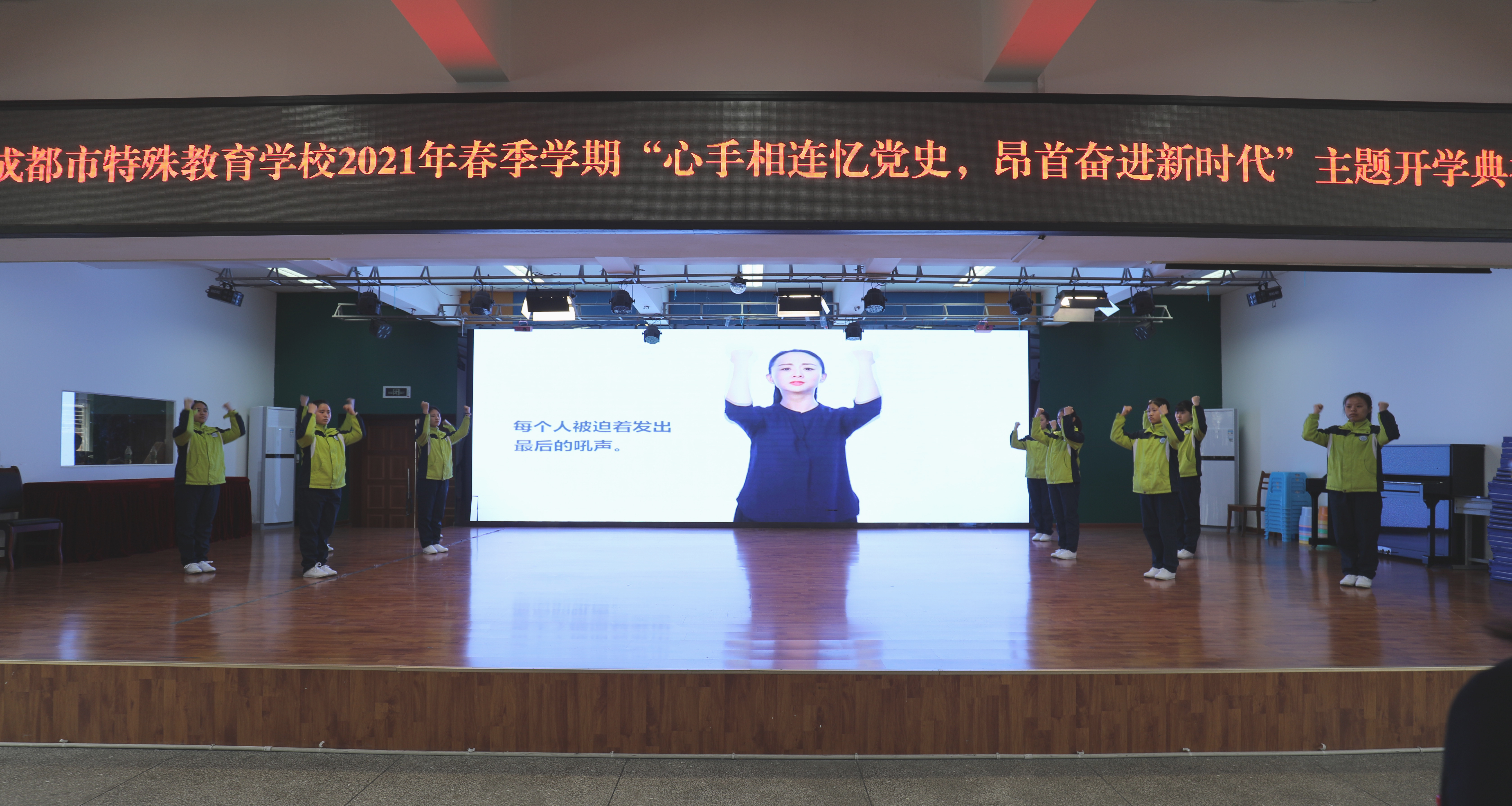 在这特殊的一天,成都市特殊教育学校举办了“心手相连忆党史,昂首奋进新时代”——2021年学校开学典礼暨庆祝建党一百周年活动。上午,成都市特殊教育学校响起了中华人民共和国国歌中开启。特别引人注目的是,全校199名聋哑学生用统一规范的通用手语版《中华人民共和国国歌》“齐唱”国歌,充分表达了他们内心深处的爱国主义情怀。