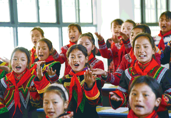 2月24日,吉觉吉竹的妹妹在学校的合唱团中唱歌。新华社记者田建川摄