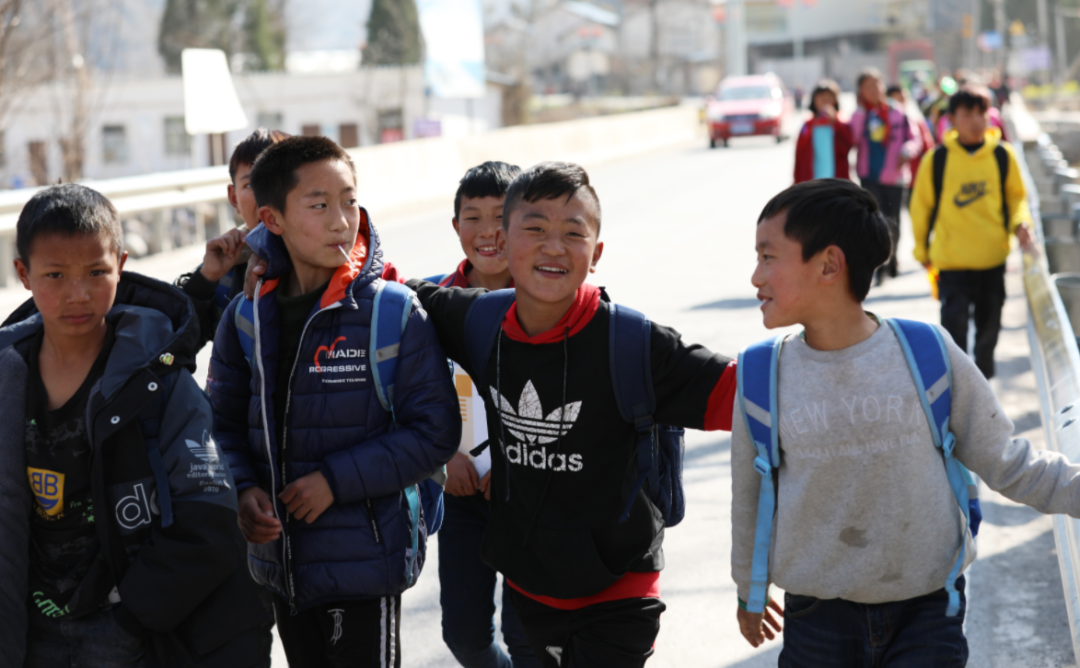 吉觉吉竹和小伙伴走在放学路上(新华社记者王瑞平摄)(2021年2月24日摄)