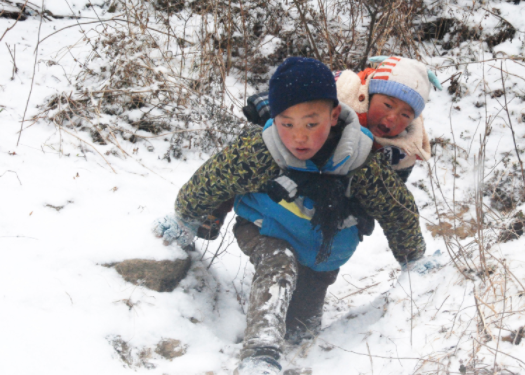 三年前的2月2日,雪下得正紧,大凉山一片苍莽,我在海拔2800多米的四川省凉山州越西县达布村结束采访,准备下山。在踉踉跄跄的途中,我偶遇9岁的“凉山男孩”吉觉吉竹背着弟弟搬家下山,他们的身后,是背着更重的背篓的母亲。