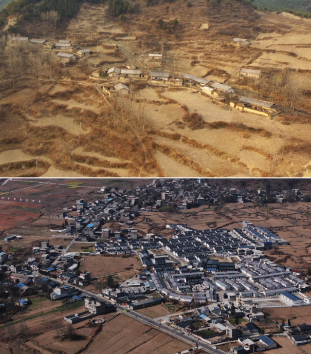 上图是2018年2月1日拍摄的越西县申果乡达布村无人机照片(新华社记者田建川摄),下图为2021年2月24日拍摄的吉觉吉竹新家所在的越西县南箐镇无人机照片(新华社记者王瑞平摄)