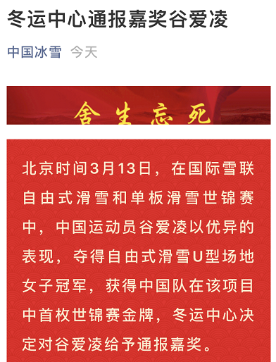 谷爱凌首次参赛就获得世锦赛金牌、创造中国冰雪历史,国家体育总局冬季运动管理中心在赛后第一时间为其送上嘉奖。