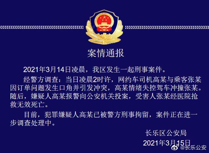 经警方调查:当日凌晨2时许,网约车司机高某与乘客张某因订单问题发生口角并引发冲突,高某情绪失控驾车冲撞张某。随后,嫌疑人高某报警向公安机关投案,受害人张某经医院抢救无效死亡。