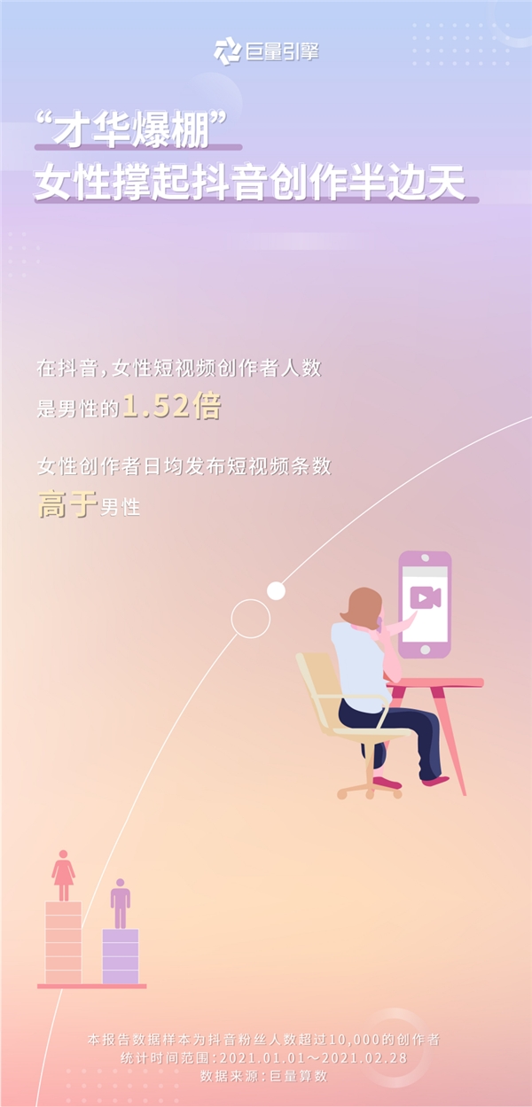 数字经济时代,女性撑起了短视频内容生产的半边天。据巨量算数报告显示,在短视频、直播、直播带货等数字领域,不仅女性创作者人数高于男性,而且他们创作力很强,整体上人均发布视频数高于男性。