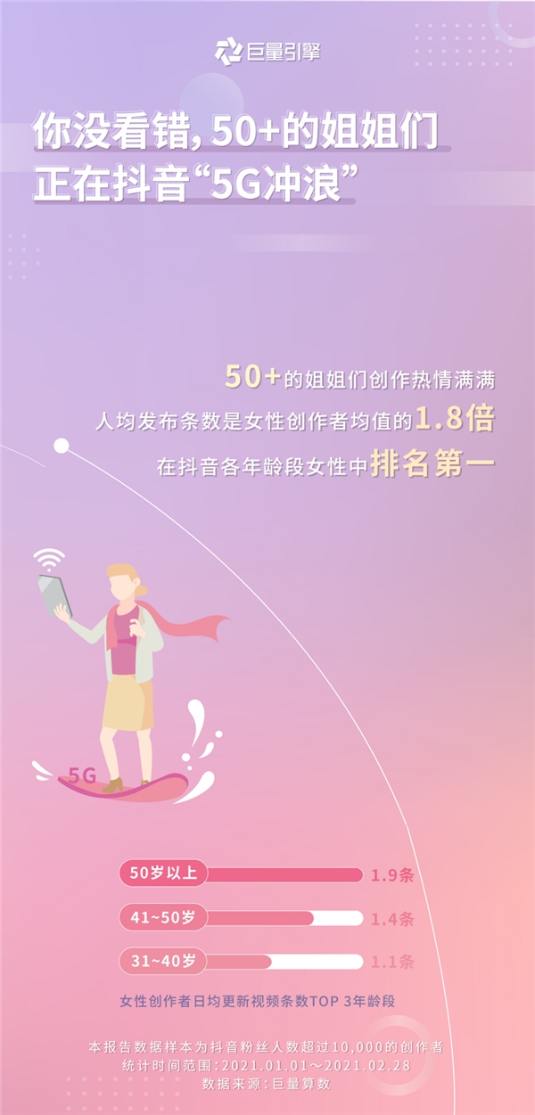 相比90、00后,80后在短视频、直播等领域女性创作者数量均位居第一,成为创作者的主力军。但在创作热情上,无论是00后、90后还是80后都难敌60后,50岁以上的姐姐们在抖音上“5G冲浪",换装走秀、自驾游,她们除了广场舞之外,更是心怀青春,在抖音乘风破浪。数据显示,她人均每日发布视频2条,日均创作数量是90后的3倍,是80后的1.7倍。