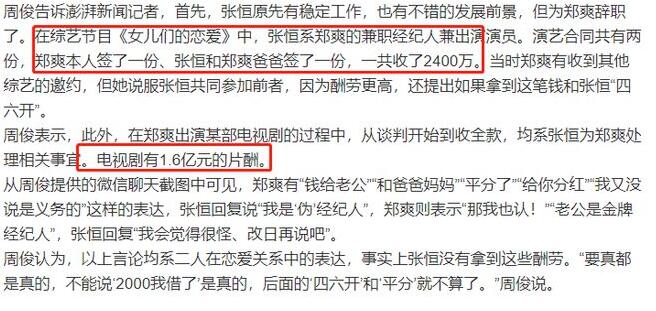 张恒代理律师周俊还曝光了郑爽和张恒两人录制某档综艺的片酬,高达2400万元。周俊称在综艺节目《女儿们的恋爱》中,张恒系郑爽的兼职经纪人兼出演演员。