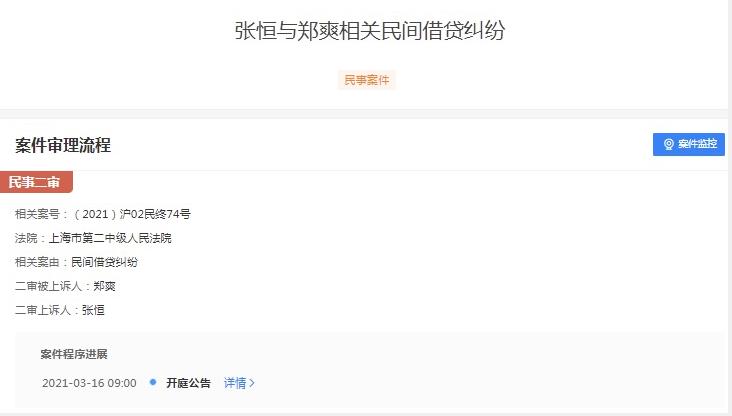 3月16日,张恒与郑爽相关民间借贷纠纷开庭,相关案号为(2021)沪02民终74号,当前审理程序民事二审,相关案由为民间借贷纠纷,审理法院上海市第二中级人民法院,二审被上诉人为郑爽,二审上诉人为张恒。