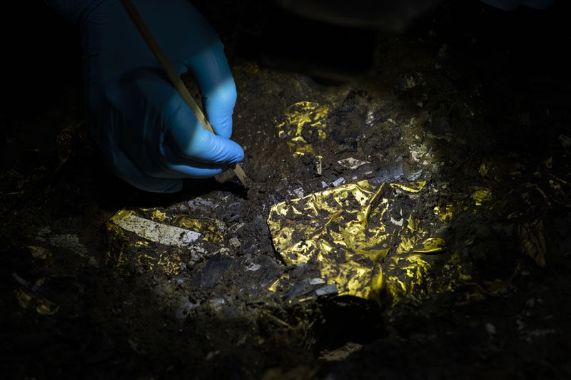 在位于四川省广汉市的三星堆遗址5号“祭祀坑”中,考古人员在清理新发现的金面具残片(3月1日摄)。