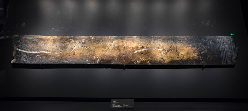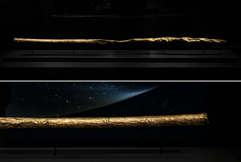 拼版照片——上图是在位于四川省广汉市的三星堆博物馆拍摄的1986年出土于三星堆1号“祭祀坑”的金杖;下图是金杖的局部(3月17日摄)。金杖系用金条捶打成金皮后,再包卷在木杖上,出土时木芯已炭化,仅存金皮,金皮内可见炭化的木渣。