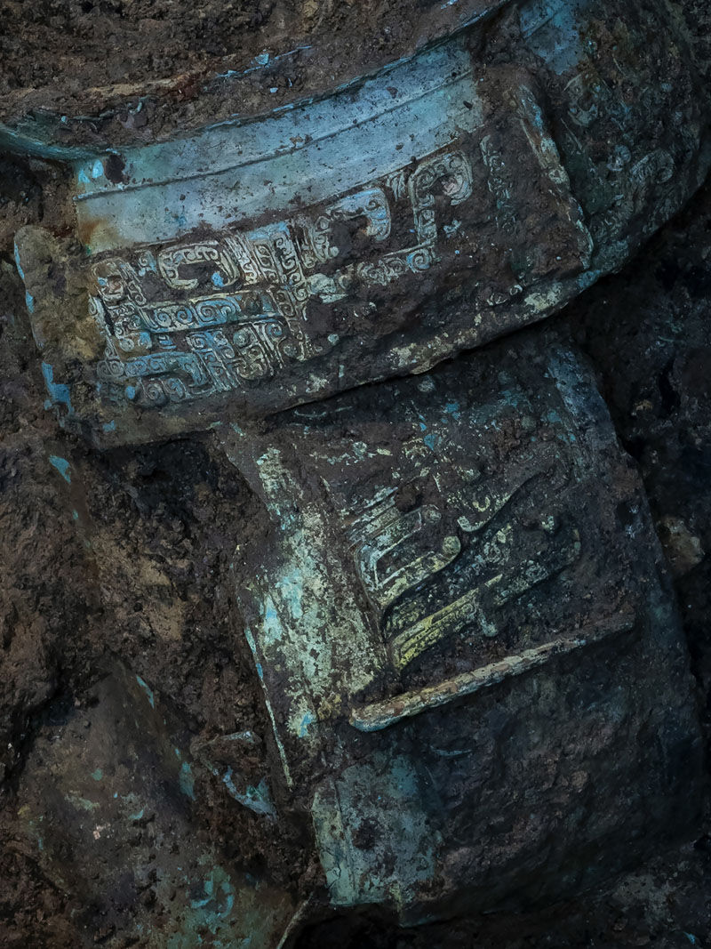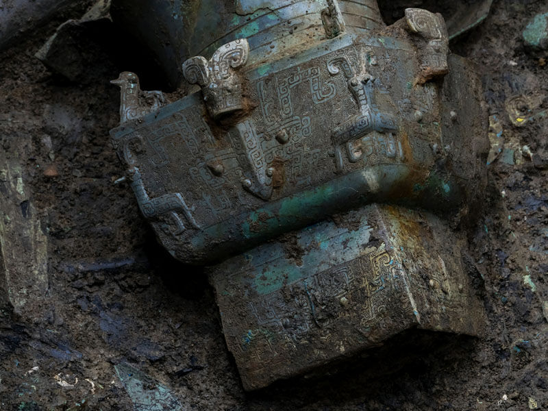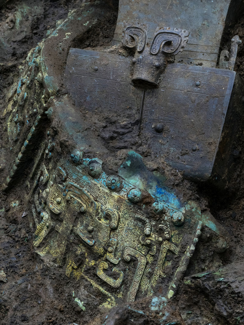 这是在四川省广汉市拍摄的三星堆遗址3号“祭祀坑”中新发现的青铜器局部(3月16日摄)。