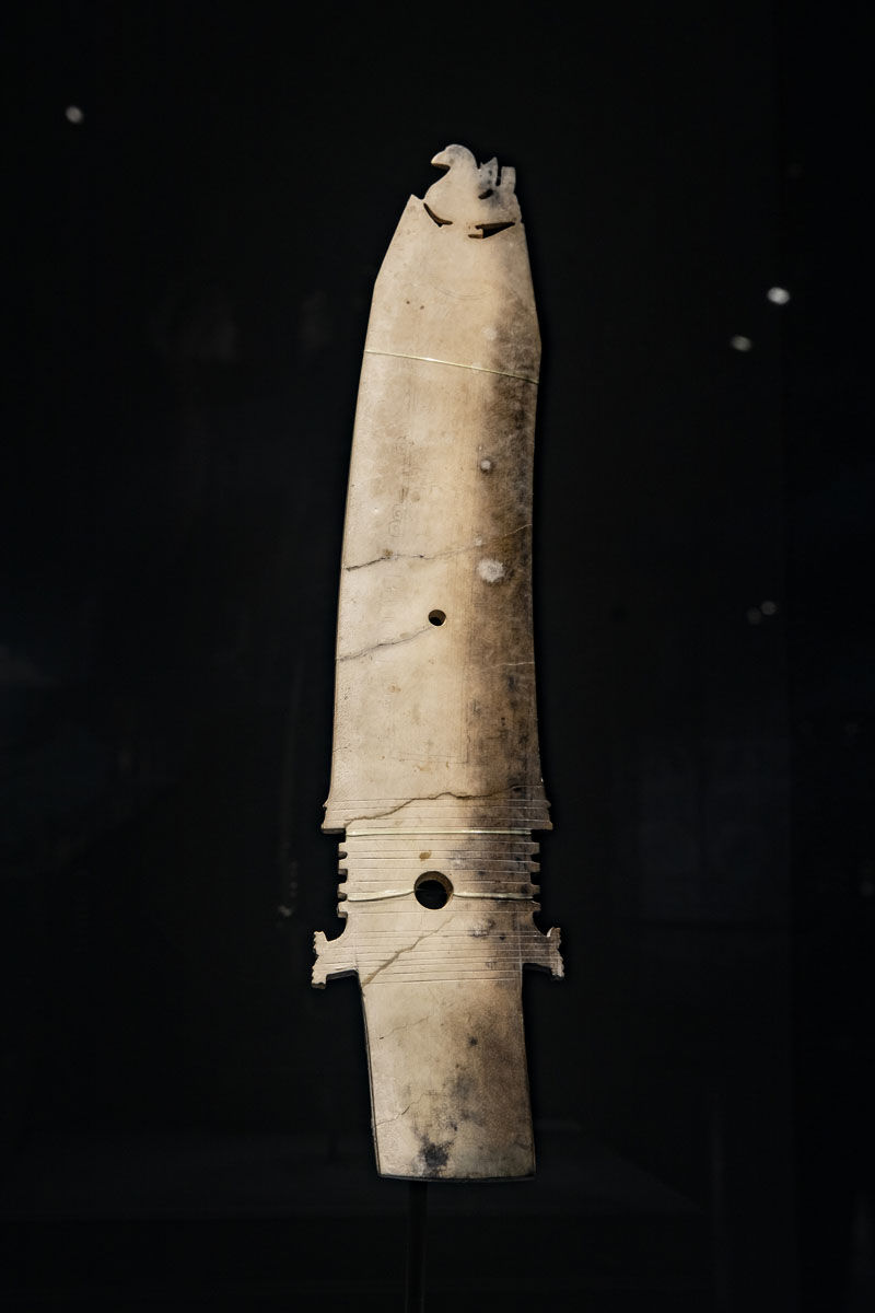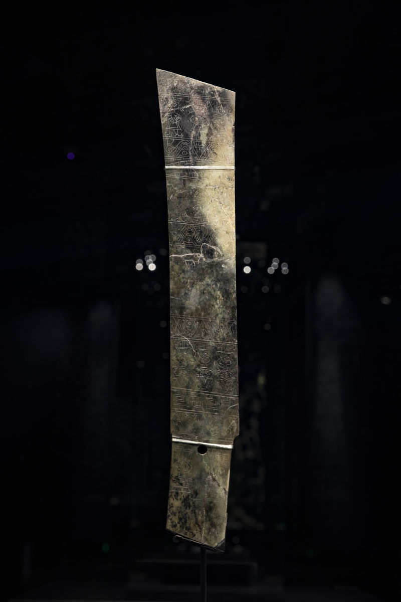 这是在位于四川省广汉市的三星堆博物馆拍摄的1986年出土于三星堆1号“祭祀坑”的玉边璋(3月17日摄)。
