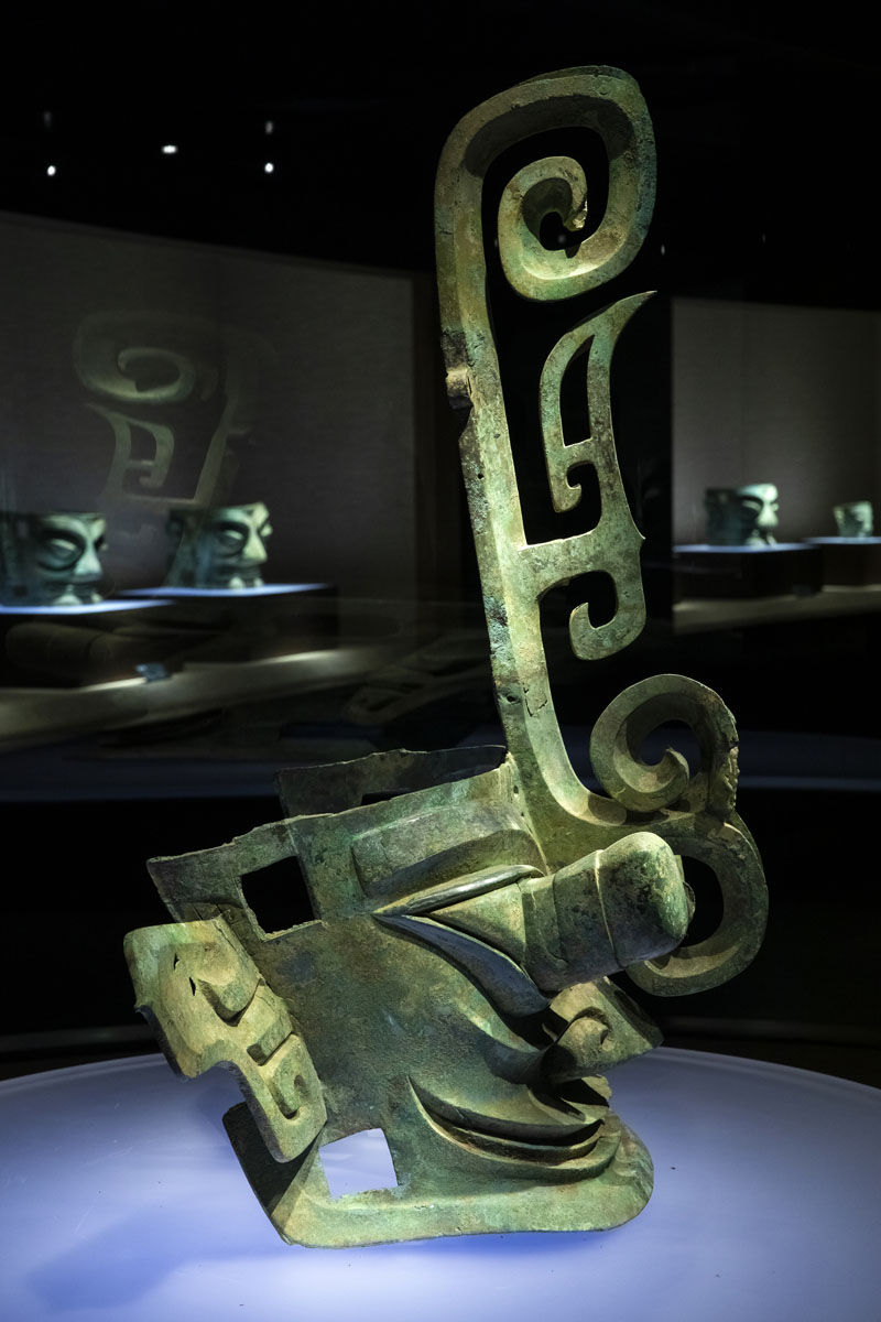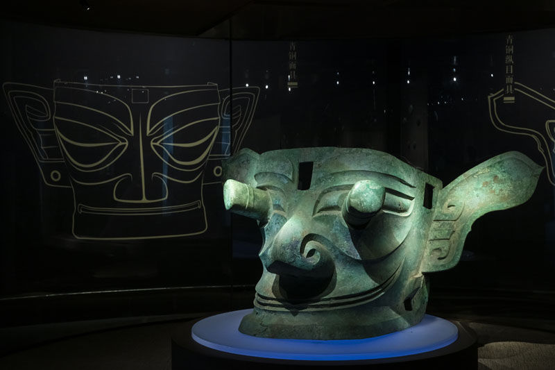 这是在位于四川省广汉市的三星堆博物馆拍摄的1986年出土于三星堆2号“祭祀坑”的青铜兽首冠人像(3月5日摄)。