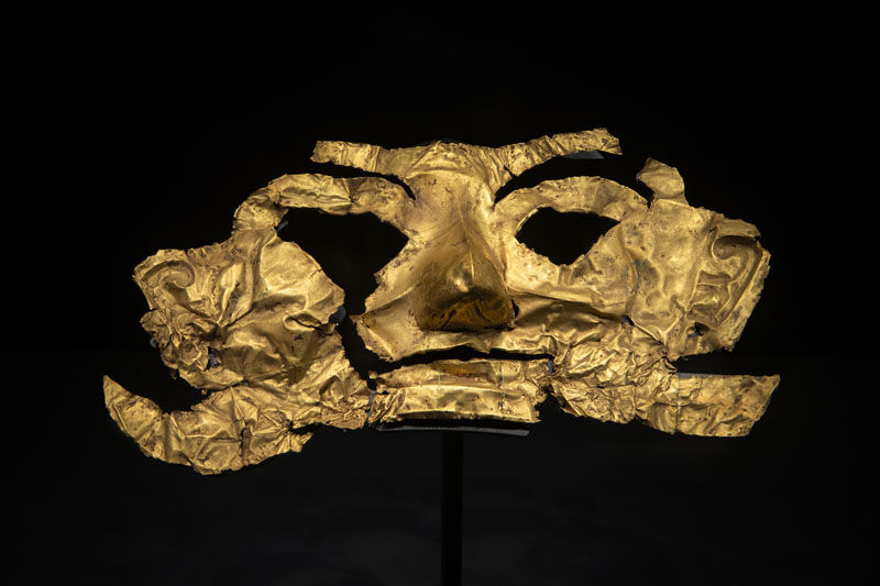 这是在位于四川省广汉市的三星堆博物馆拍摄的1986年出土于三星堆1号“祭祀坑”的金面罩(3月17日摄)。该金面罩系用金皮锤拓而成,其形制与金面铜人头像上的金面罩形同。