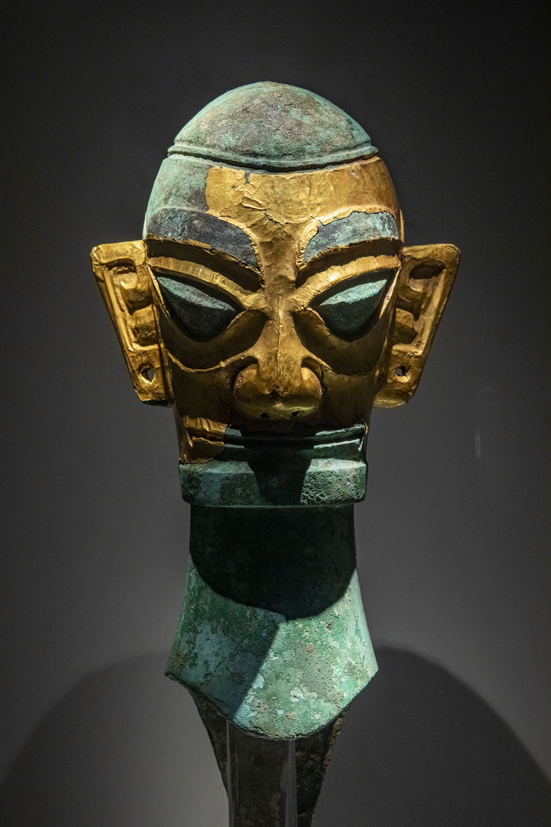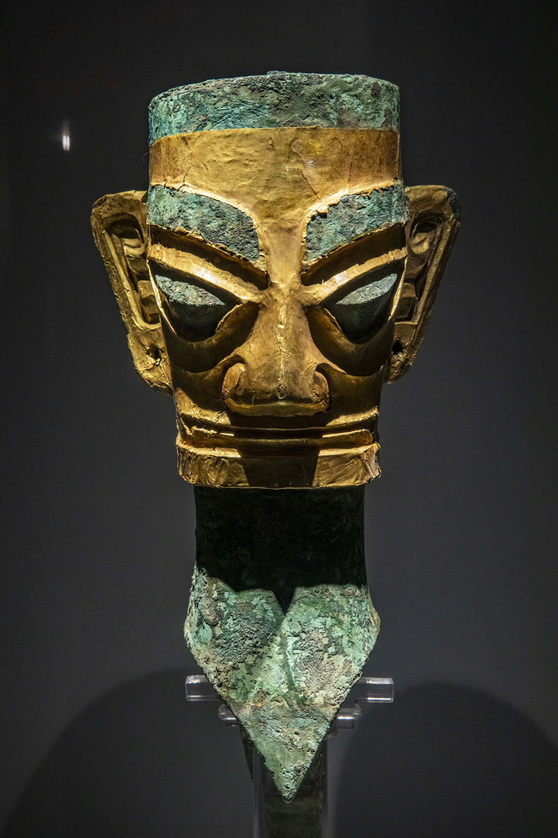 这是在位于四川省广汉市的三星堆博物馆拍摄的1986年出土于三星堆2号“祭祀坑”的戴金面罩青铜人头像(3月5日摄)。