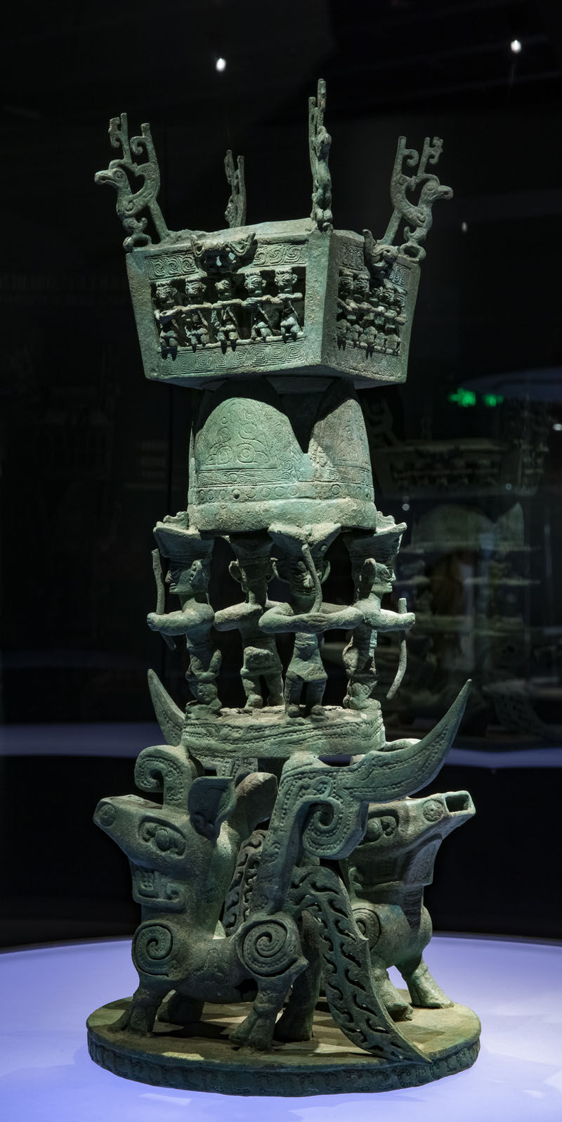 这是在位于四川省广汉市的三星堆博物馆拍摄的1986年出土于三星堆2号“祭祀坑”的青铜神坛(研究性复原件,3月5日摄)。该器可分为三层:底层是一对头尾相向的神兽;中层为四立人及头顶的山峰;上层有建筑及人物、飞鸟造型等,建筑额间有人首鸟身神像。其竖向垂直展开的时空序列表征天、地、人“三界”,生动形象地展现了古蜀人的神话宇宙观。