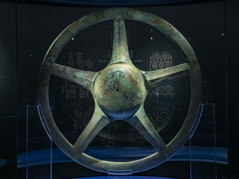 这是在位于四川省广汉市的三星堆博物馆拍摄的1986年出土于三星堆2号“祭祀坑”的青铜太阳轮(3月5日摄)。