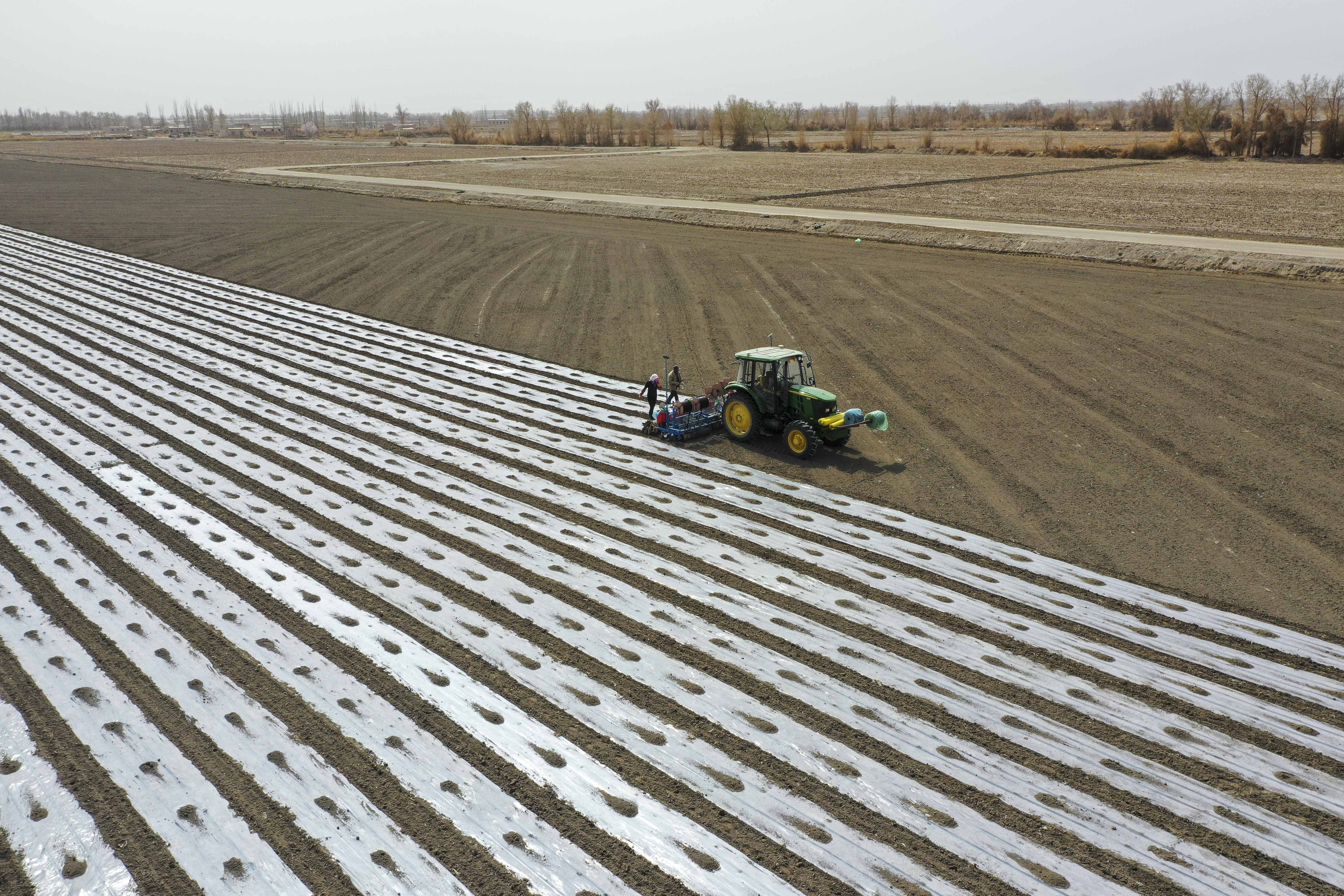 3月28日,在新疆尉犁县塔里木乡英努尔村,农民驾驶大马力拖拉机在棉田里进行铺膜作业。(新华社发,汪志鹏摄)