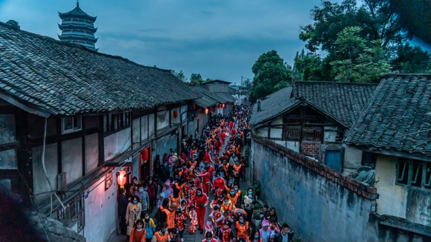 在此之前的4月2日晚,元通古镇还举行了独特的“拉兔灯”活动——在元通,兔子被赋予了吉祥、如意等美好寓意,由孩子们为主的游行队伍,拉着一支支点亮的兔子造型花灯,行走在古镇的长街上,祈福送福。兔灯的灯火,由德高望重的老人从惜字宫的字库塔里取出,象征着对传统文化的尊重和渊远民风的传承,更表达着在中国共产党成立100周年的伟大时刻,幸福感越来越强的崇州人民对党美好的祝愿,和对未来生活的期盼与信心。