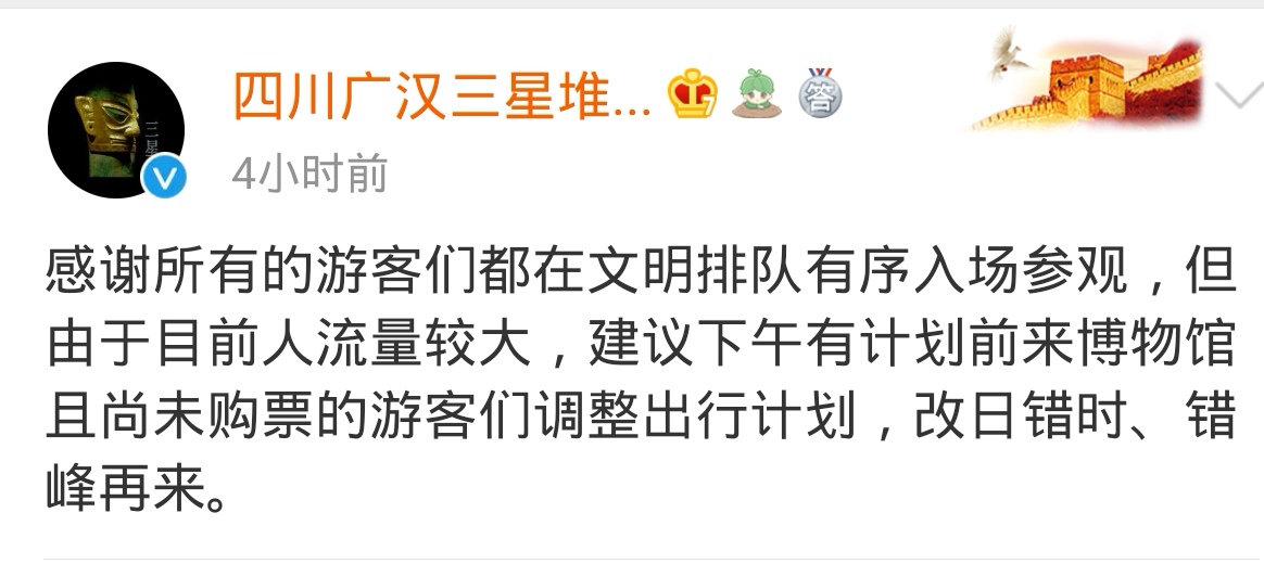 4月4日下午,三星堆博物馆官方发出提示,建议未购票的游客调整出行计划,改日错时、错峰再来。值得一提的是,“堆堆”还通过微博赞美游客。“大家都自觉遵守着文明和谐的游览秩序,等待检票入馆的那一列列队伍,已然成为了景区一道靓丽的风景线。”
