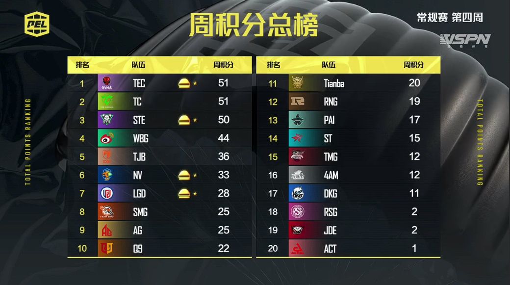 第四周结束后,各支队伍改写自己总积分的机会只剩一次,除了四支夺得过周冠军的队伍,以及长期稳定发挥位居积分榜前列的TC、WBG和TJB等队伍之外,还有多支高人气队伍没有确定总决赛资格,其中表现大起大落的DKG,以及PEL老牌强队4AM的落后,格外引人注目。