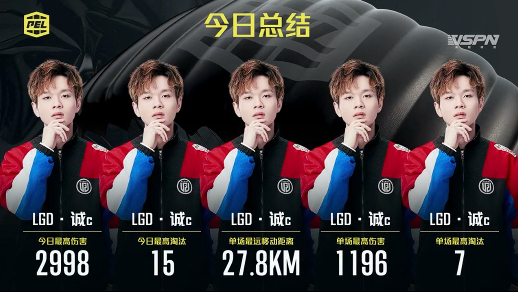 周决赛首日,LGD以73分让领跑积分榜,次日诚C更是火力全开,带领队友不断积极拼抢淘汰分,周决赛次日诚C个人更是包揽5项单日最佳数据,打破了之前周决赛单日个人包揽4项最佳数据的记录,带领队伍夺得周冠军殊荣,无愧千万先生之名。
