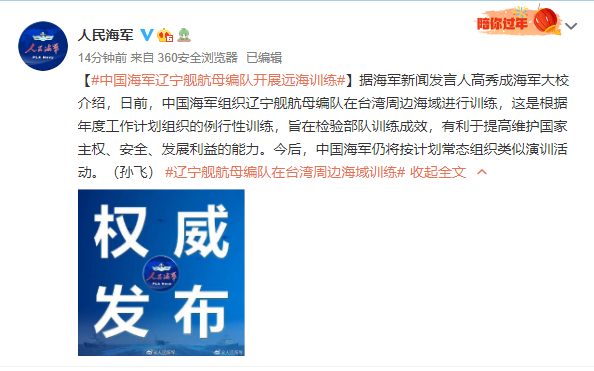 据海军新闻发言人高秀成海军大校介绍,日前,中国海军组织辽宁舰航母编队在台湾周边海域进行训练,这是根据年度工作计划组织的例行性训练,旨在检验部队训练成效,有利于提高维护国家主权、安全、发展利益的能力。今后,中国海军仍将按计划常态组织类似演训活动。