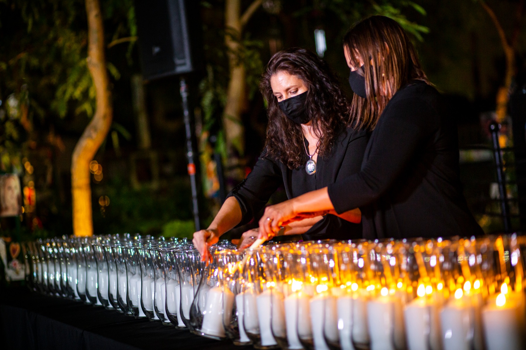 2020年10月1日,美国拉斯维加斯大规模枪击案三周年纪念日,两名女士在拉斯维加斯举行的悼念活动中点燃蜡烛,悼念遇难者。2017年10月1日,枪手斯蒂芬·帕多克从拉斯维加斯曼德勒海湾酒店32层房间向楼下参加露天音乐节的人群持续扫射,造成58人遇难,数百人受伤,成为美国现代史上最严重的枪击案。(新华社/美联)