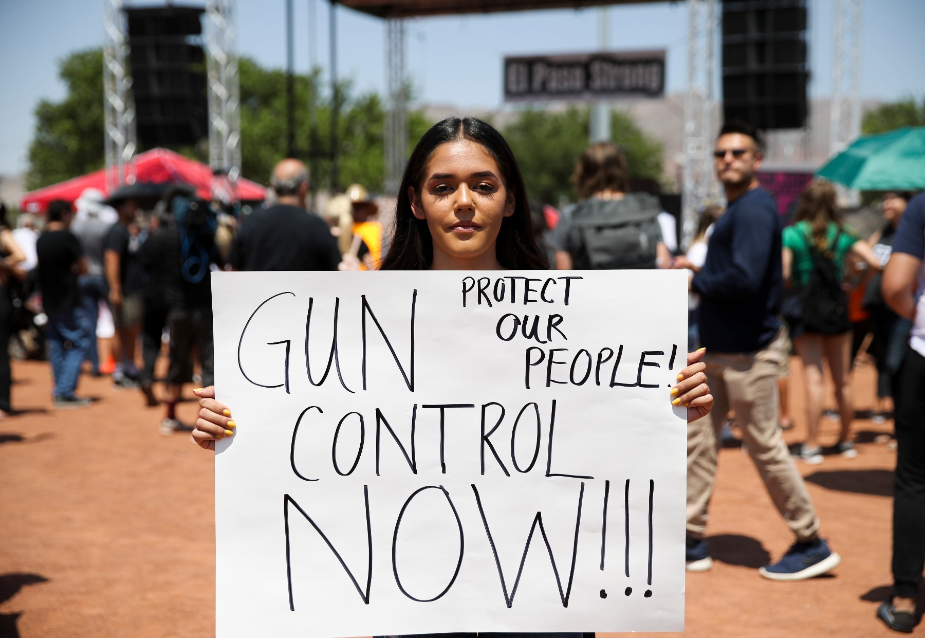 2019年8月7日,在美国得克萨斯州埃尔帕索市的一个公园里,一名女子参加抗议种族主义、呼吁控枪的集会。埃尔帕索市8月3日发生严重枪击事件,造成22人死亡。(新华社记者王迎摄)