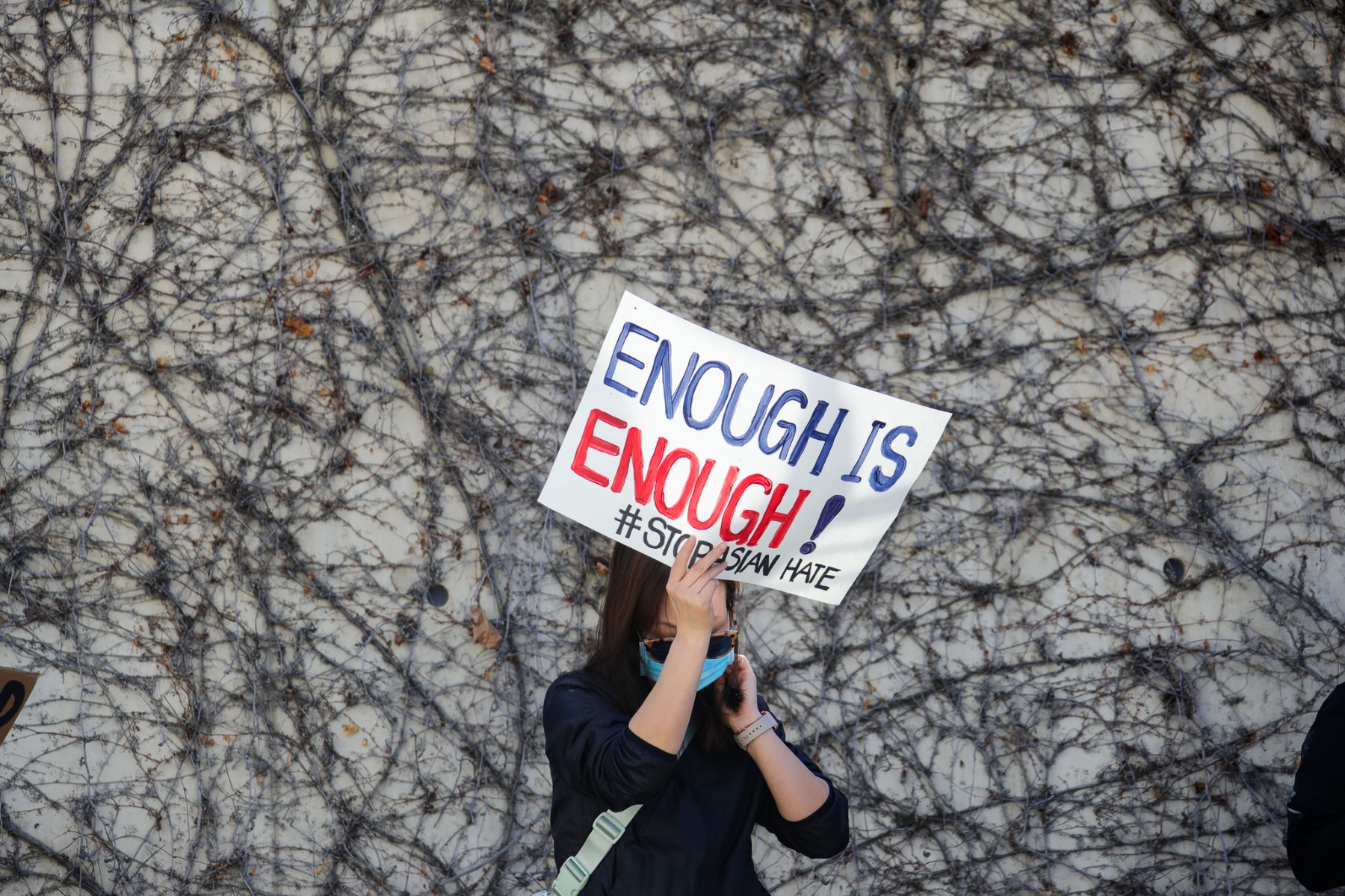 3月21日,一名示威者在美国加利福尼亚州旧金山湾区城市圣何塞参加集会,抗议针对亚裔的歧视行为和仇恨犯罪。(新华社发,董旭东摄)
