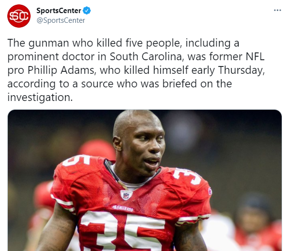 据美联社报道,一名美国前职业橄榄球大联盟球员于当地时间周三枪杀了包括医治过自己的医生在内的5人,随后于周四凌晨自杀。这名行凶的退役球员名叫菲利普·亚当斯,32岁,曾在美国职业橄榄球大联盟效力多年。当地警方称,被他枪杀的5人包括一名医治过他的70岁的知名医生,该医生69岁的妻子,以及两人的9岁和5岁的孙辈。一名在这名医生家中工作的38岁男子,也被射杀在了医生家的外面。亚当斯自己则在行凶后的次日凌晨自杀。