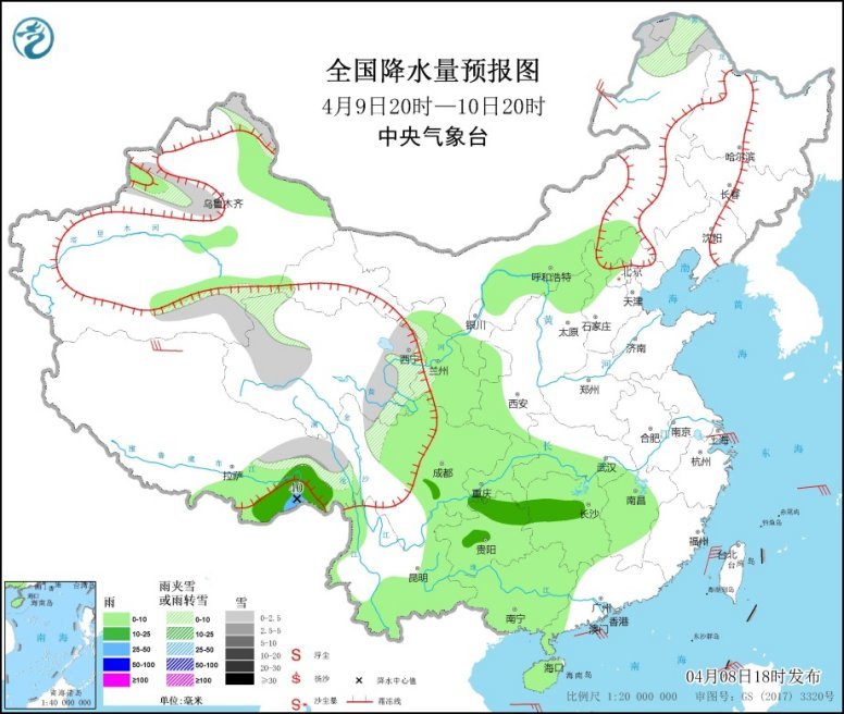 4月9日20时至10日20时,内蒙古东北部、黑龙江西北部、新疆北部和沿天山地区、青海东部和西部、川西高原北部等地部分地区有小到中雪或雨夹雪。西藏东部、湖南中西部、贵州北部等地部分地区有中到大雨(25~40毫米)。