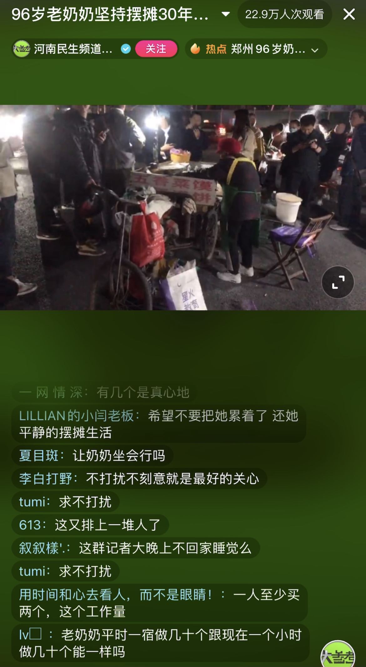 封面新闻记者联系到河南《大河报》的同行卢女士,她证实说,这个老奶奶和她通宵出摊卖菜馍的事情,真的存在,“(老奶奶)在郑州已经火了几年了。河南电视台的一档美食节目还采访过她,两年前推出了一期视频节目,现在在B站还能看到。”卢女士言语之间带着钦佩,“这老太太,可了不起啊。她家里其实不是特别穷,有儿有女的。摆摊并不是为生活所迫,是她自己想做点事。听说家里人劝她不要再干活了,但没劝动她。她90多岁了,身体特别好。半夜出摊儿,大概是因为那个点,老有人买吧。”