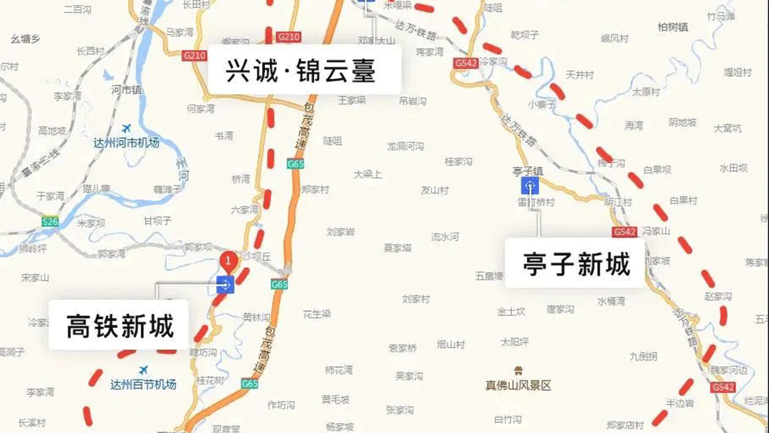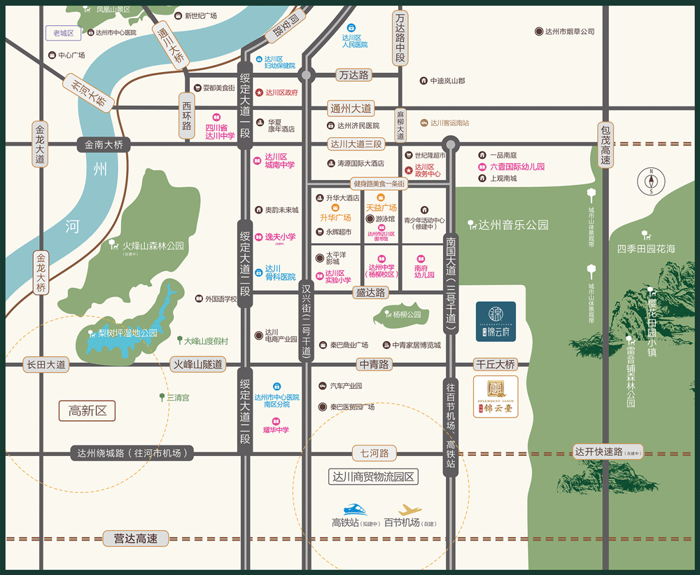 从区位上来看,高铁新城与亭子新城位于达州城南以南,高铁新城、亭子新城与达川城区呈三足鼎立之势,而处于新南外核心位置的兴诚·锦云臺,连接上千丘大桥和雷音铺大桥,既可携南外现有之繁华,又可取“两城”未来发展之大势。