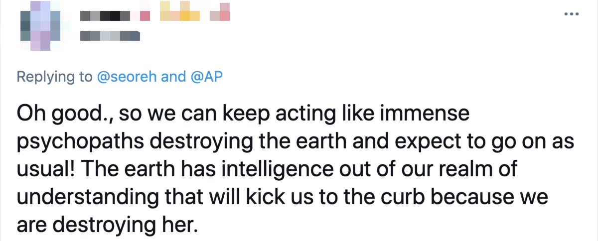 网民:“地球拥有我们无法理解的智慧,它会把我们踢到一边,因为我们正在摧毁地球。”↓↓↓