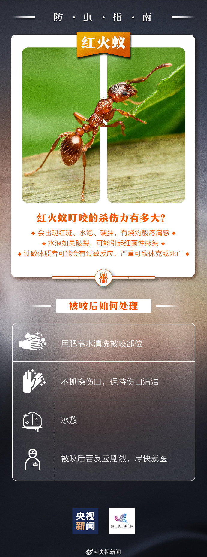 转存!被毒虫咬伤如何处理 @央视新闻 2021-04-15 09:22 35823 近期,气温回暖,许多毒虫也开始“蠢蠢欲动”。一旦被叮咬可能感染多种疾病,严重的可致死亡。红火蚁、螨虫、跳蚤…遇到这些毒虫如何防范?戳图了解↓↓ 评论 0 还没有添加任何评论,快去APP中抢沙发吧! 我要评论