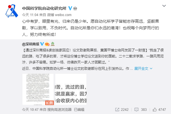 随后,@中国科学院自动化研究所 转发了黄国平给网友的回信,并附文:“心中有梦,眼里有光,归来仍是少年。愿自动化所学子皆能志存高远,坚毅果敢,学以致用,不负时代。也祝每个向梦而行的人,努力终有所成!”