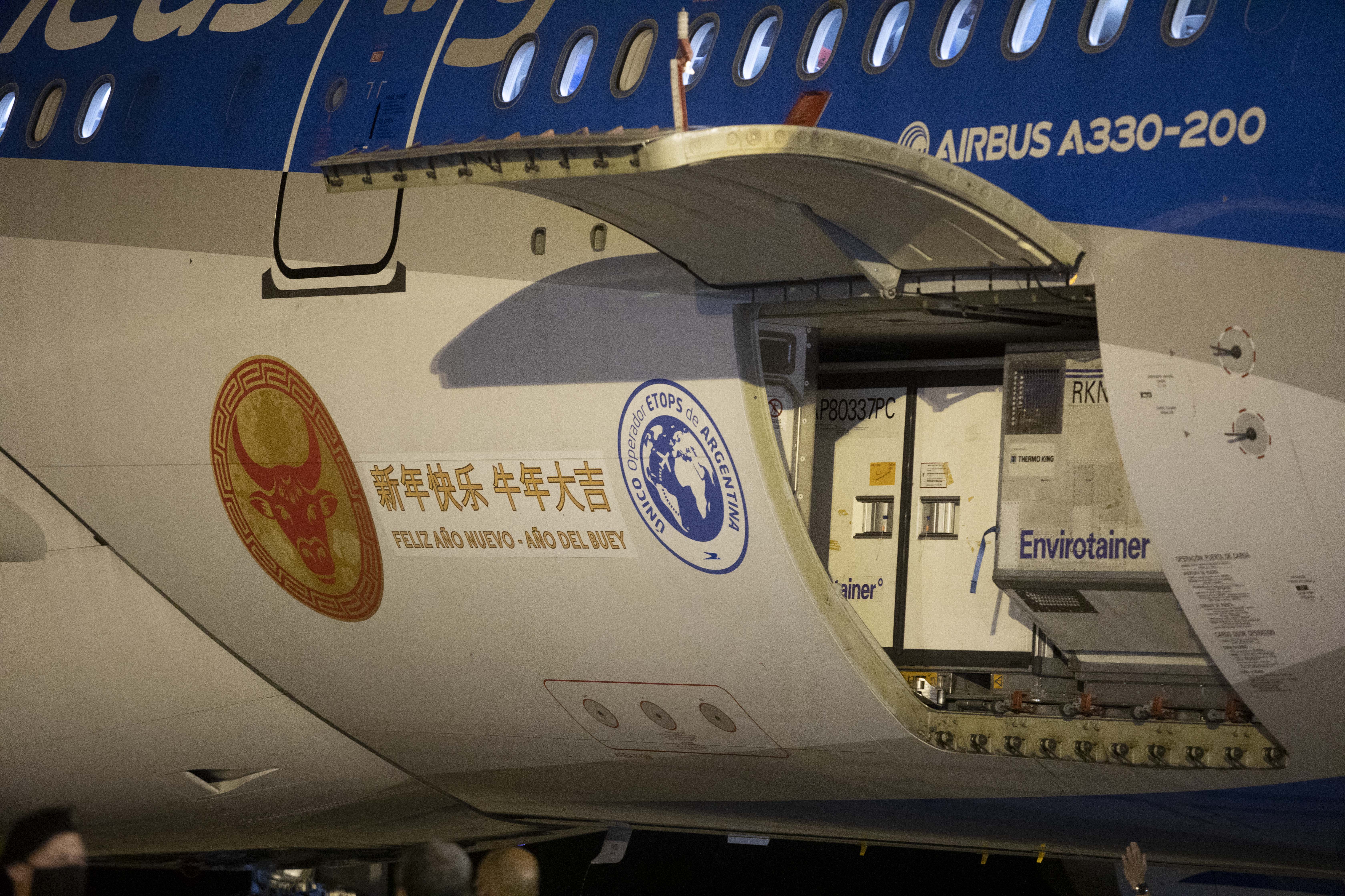 2021年2月25日,一架运载首批中国新冠疫苗的阿根廷航空公司包机当晚抵达阿首都布宜诺斯艾利斯埃塞萨国际机场。为表达对中国的感谢,阿根廷政府特意在包机上做了中国传统剪纸生肖牛的图案设计,并用中文和西班牙文在机身印上了“新年快乐 牛年大吉”字样。(新华社发)