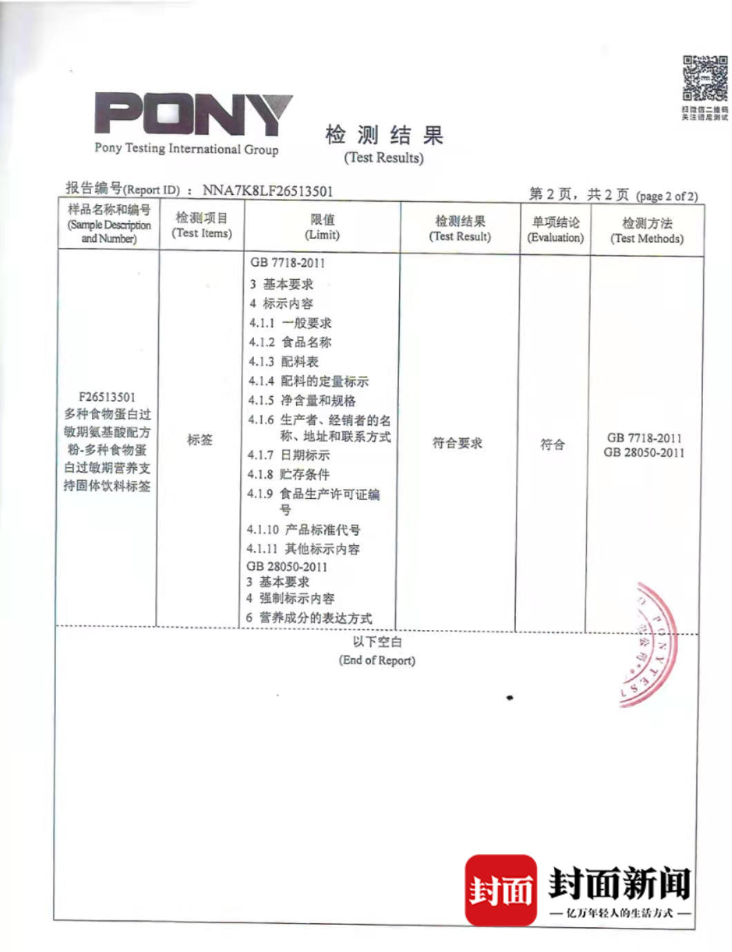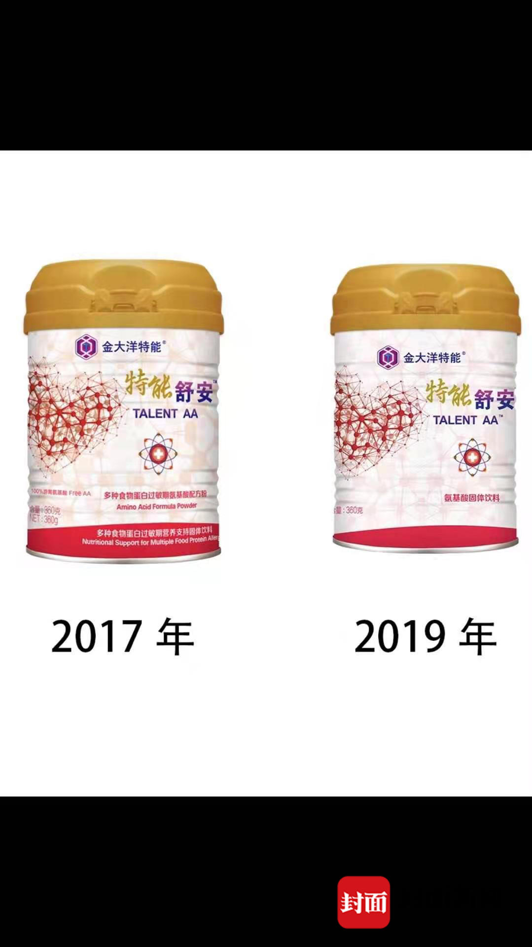柳孔圣律师向封面新闻记者提供了取样现场的录像,称所谓“标签不合格”主要指的是产品外包装上的标签、产品属性标识位置不够醒目等问题。金大洋曾于2019年5月17日委托“PONY青岛谱尼测试有限公司”,对“深度水解乳蛋白固体饮料标签”、“多种食物蛋白过敏期氨基酸配方粉-多种食物蛋白过敏期营养支持固体饮料标签”进行检验,结果均为“符合要求”。