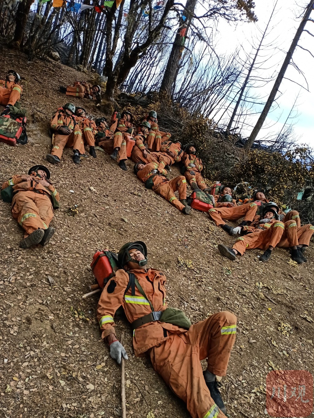 4月11日,九龙大队被安排阻击已越过山脊线的北线火头。北线火头位于海拔4000余米的绒古沟山,按照正常行军速度,需要约4小时才能抵达火场。4排排长,今年刚满22岁、有着“飞毛腿”之称的邱衣母子,率尖刀班先行到达火场侦察,用时仅2小时。