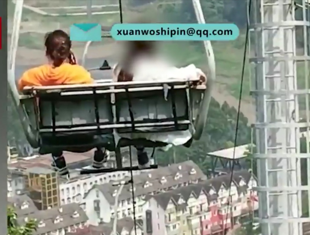 游客坐在悬停索道的座位上,与工作人员相互争吵。图为网络视频截图