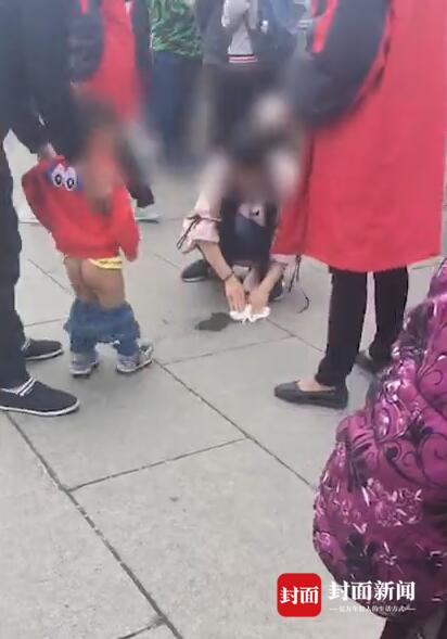 男童解手完毕,女子用卫生纸将排泄物简单清理了一下。